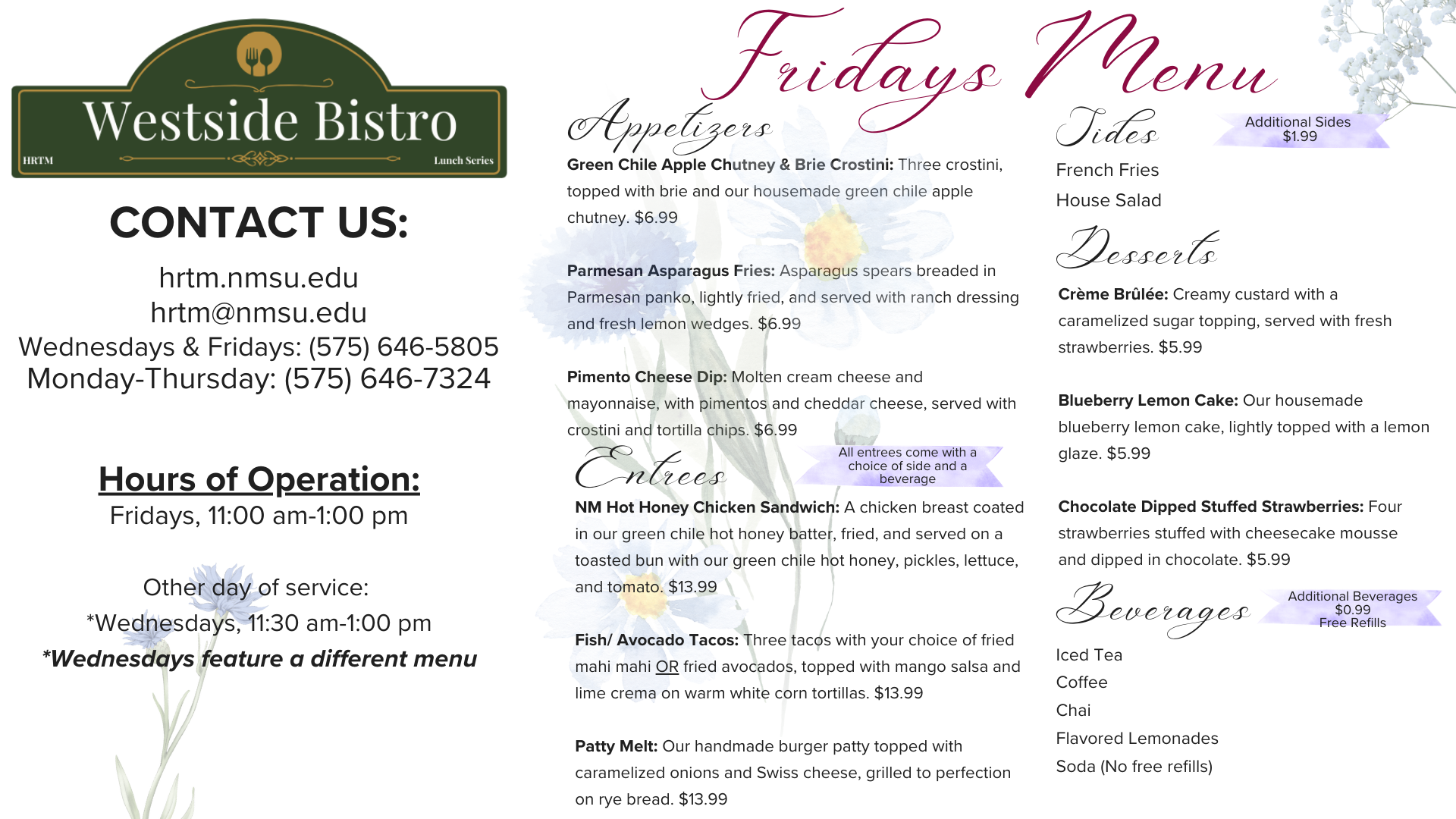 100 West Café is a food laboratory for students in our HRTM 3310 and 4320 classes to provide hands on experience in food preparation and service. We have a new menu and decor courtesy of our HRTM 3210 Marketing class and are proud to introduce the Westside Bistro lunch series. We are located in Gerald Thomas Hall at 940 College Drive on NMSU's Main Campus in Las Cruces, NM.